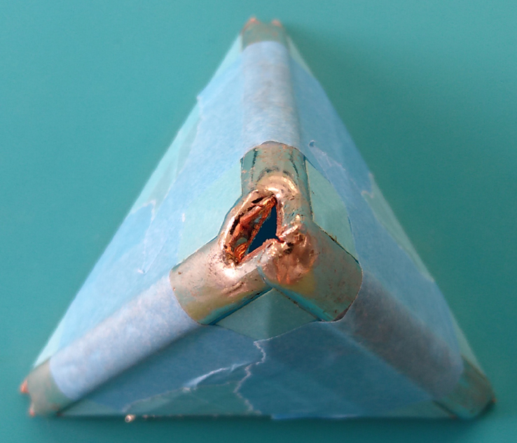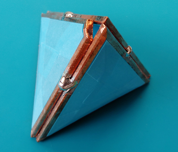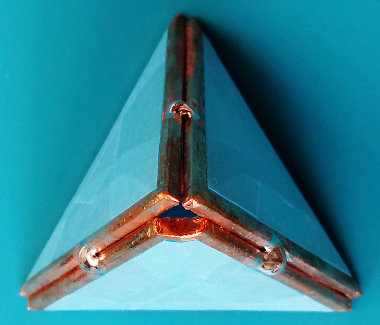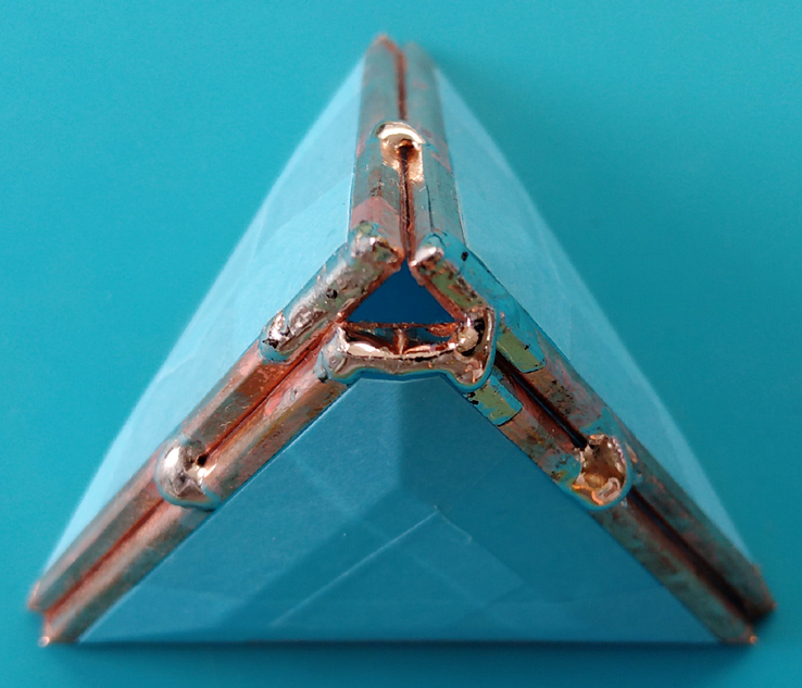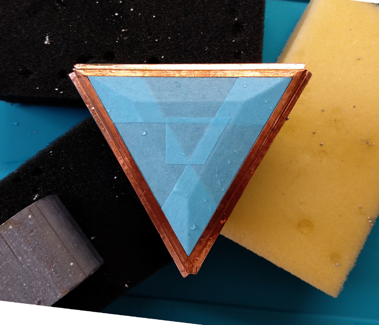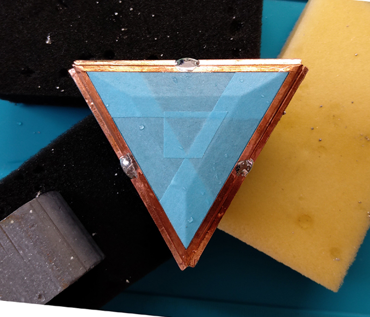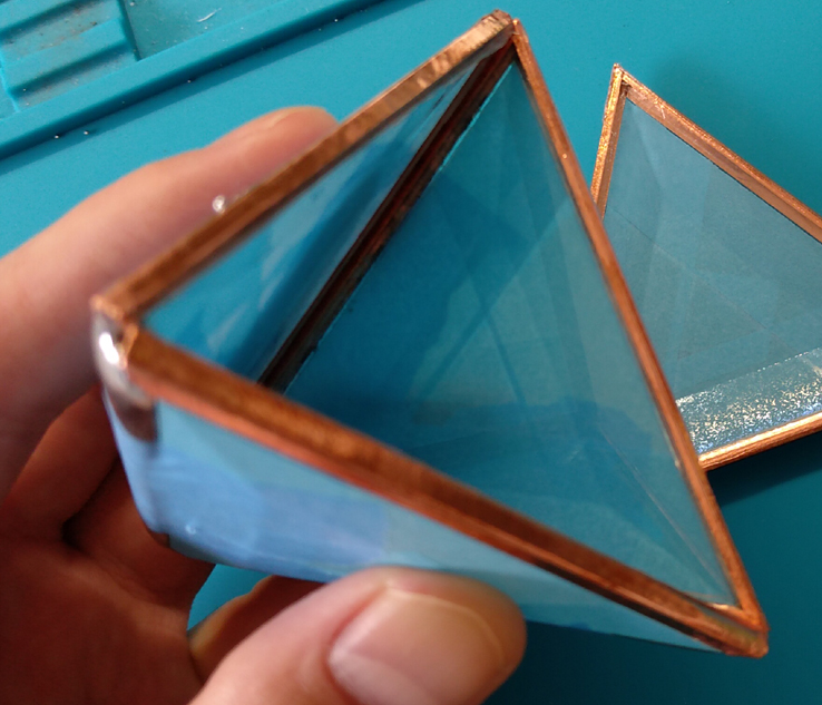 洗い終わった三角錐と1枚のガラスを接合します。 ※ハンダ付けの前にかならず液体フラックスをハンダ付けする部位に塗ります。![]() ![]() 三角錐を逆さにしてスポンジで固定し、ガラスをで蓋をします。![]() ![]() 3辺をハンダで仮止めした後、「4.ピースを接合1」と同じようにハンダ付けしてマスキングテープを貼ります。 |