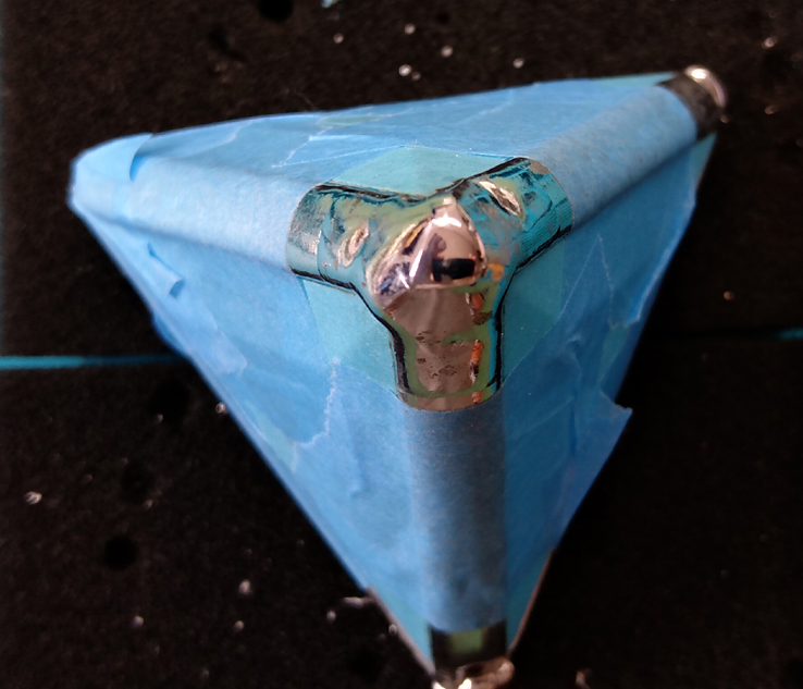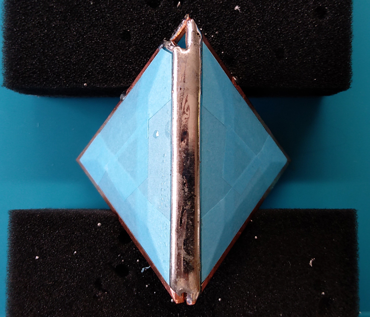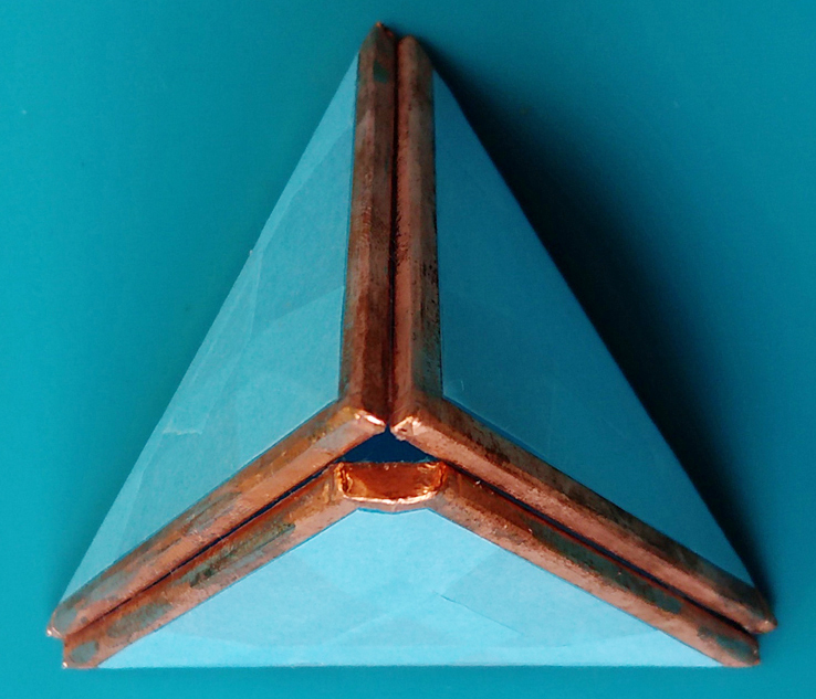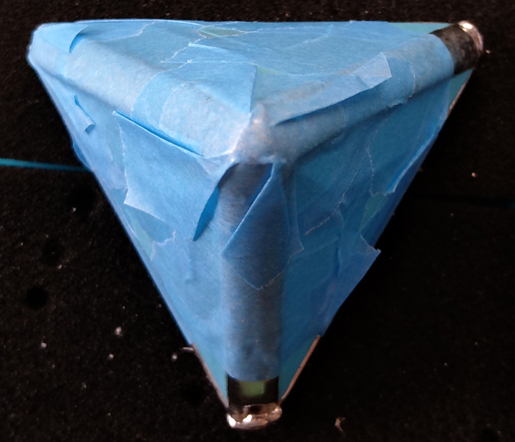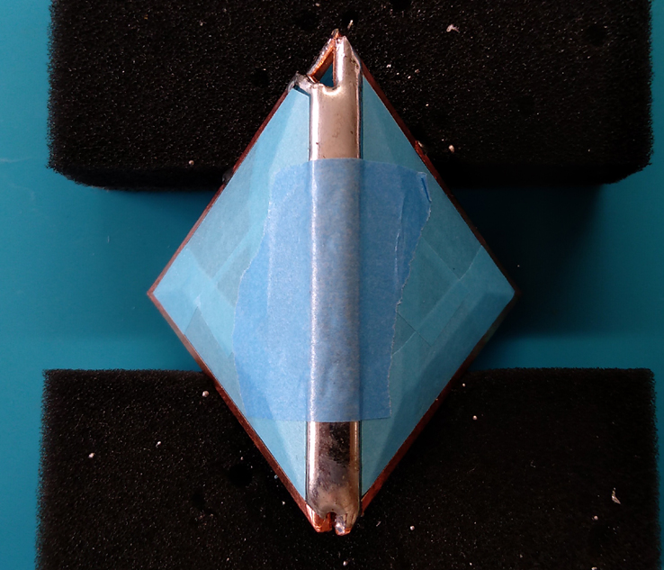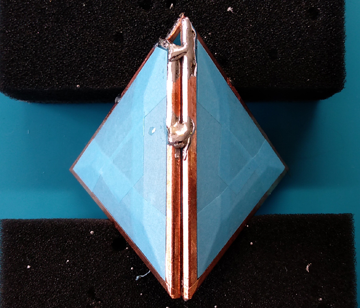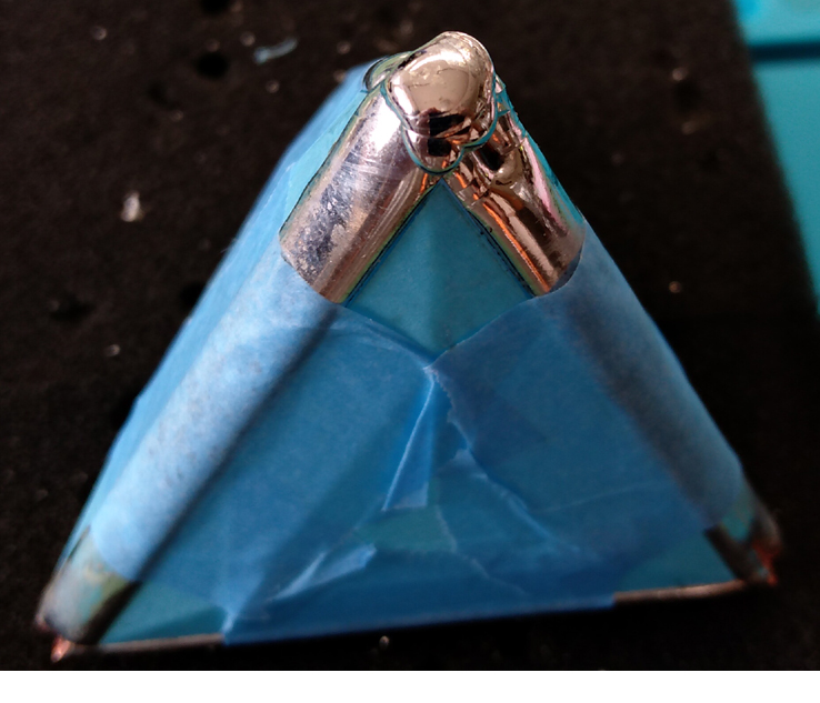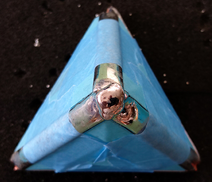 洗い終わった三角錐と1枚のガラスを接合します。 ※ハンダ付けの前にかならず液体フラックスをハンダ付けする部位に塗ります。![]() ![]() 三角錐を逆さにしてスポンジで固定し、ガラスをで蓋をします。![]() ![]() 3辺をハンダで仮止めした後、「4.ピースを接合1」と同じようにハンダ付けしてマスキングテープを貼ります。 |