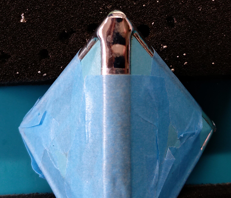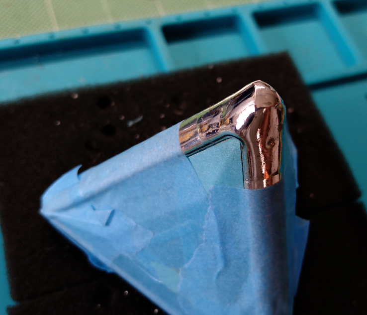 角に穴があいた状態なので、埋めていきます。 ※ハンダ付けの前にかならず液体フラックスをハンダ付けする部位に塗ります。![]() ![]() ![]() ![]() できるだけ頂点が丸くなるようにハンダをのせていきます。![]() ![]() ![]() ![]() ![]() ![]() 食器洗い用スポンジで辺が水平になるように置きます。 角から1cmぐらい離れたところにハンダを置いて熱で丸く盛った部分と段差がなくなるようにハンダ付けします。 ハンダゴテは動かさずに熱が伝わるのを待つ感じです。![]() ![]() うまくできたらマスキングテープで保護しておきます。 |