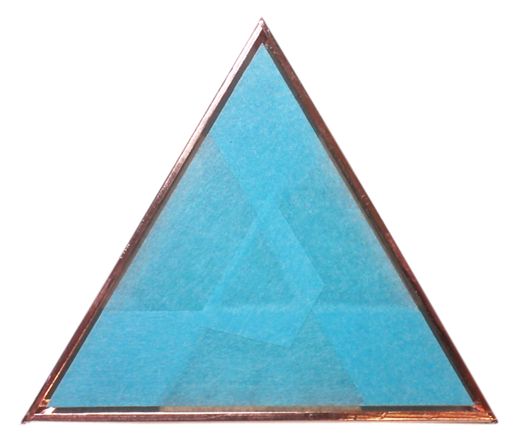 ![]() ![]() トライアングルは水をいれる口が削ってあるガラス1枚とそのままの三角形のガラス3枚を使います。 ハンダでガラスをつないでいくのですが、ガラスにはハンダが乗らないため 銅製の薄いテープ(コパーテープ)をガラスの側面に巻いてハンダが乗るようにします。 コパーテープを貼る前にアルコールスプレー等でガラスを脱脂してください。 ガラスの平らな面が内側です。 外側から見た時に内側のコパーテープや後述するシリコンが見えないように、 外側に貼る部分が内側に貼る部分より2mmほど長くなるように中心からずらして貼るとよりきれいです。 適当な長さに切ったコパーテープにガラスの側面を貼り付けたあと、外側と内側にテープが回り込むように貼ります。 端っこ等の重なる部分はプラスチックのヘラ等を使って密着させますが、それ以外は硬い道具を使って密着させると銅が伸びてしまいテープが浮いてくるので指で密着させます。 |